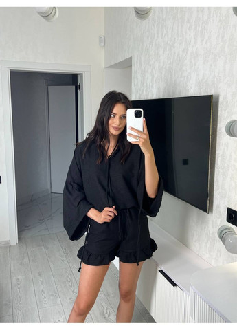 Блузка жіноча без застібки, виріз горловини - круглий, сезон - літній, стиль - повсякденний (casual), колір - чорна, тканина - шовк Армані, склад - 65% поліестер, 35% віскоза, силует - прямі, довжина рукава - вільні.