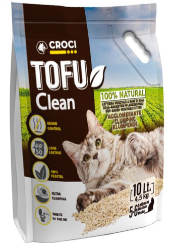 Croci Tofu – наповнювач для котячого лотка на основі Тофу. Складається із 100% натуральної сировини — спресованої маси соєвих волокон. Має виняткові властивості поглинання вологи та неприємних запахів. Його м'яка структура та легка вага робить його зручним та легким у використанні. Завдяки своїй структурі він не дратує лапи кота і тому полегшує звикання вашого улюбленця до нового наповнювача. Завдяки своєму біологічному складу наповнювач легко комкується і не розсипається під час очищення лотка. Природне походження та м'яка структура волокон робить наповнювач Croci Tofu придатним для утилізації через систему загальної каналізації шляхом змивання в унітаз. Його також можна використовувати як комплексне мінеральне добрива для садових рослин. Склад: спресована маса соєвих волокон, харчовий крохмаль, гуарова камедь. Вміст вологи: менше 10%. Поглинаюча здатність: понад 300%. Рекомендації щодо використання: 1. Наповніть сухий та чистий лоток вмістом пакета шаром 5-6 сантиметрів. 2. Регулярно видаляйте тверді випорожнення. 3. Перемішуйте вміст лотку раз на 1-2 дні. 4. Приблизно 1 раз на 4 тижні повністю замінюйте наповнювач на свіжий. 5. Можна змивати в унітаз невеликими порціями! 6. Якщо тварині важко пристосуватися до нового наповнювача, спробуйте протягом тижня змішувати його з тим наповнювачем, яким користувалися раніше у співвідношенні 1:1. Але пам'ятайте, що це може знизити поглинаючі та комкуючі властивості наповнювача. Запобіжні заходи: не слід зберігати наповнювач поруч із продуктами та кормом для тварин; після використання вимити руки; залишок наповнювача зберігати в щільному закритому пакеті; берегти від дітей, щоб уникнути ризику випадкового проковтування. Зберігати у сухому місці при відносній температурі +25°С та відносній вологості не більше 45%. Термін придатності не обмежений. Дата виробництва вказана на стікері та збігається з номером партії виробництва. Безпечно. Відповідає сертифікатам ISO9001, SGS, BSCI.