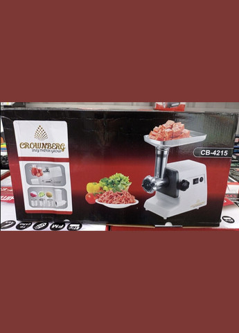 М'ясорубка електрична Crownberg CB-4215 з шинковицею (3200 Вт) Призначена для виготовлення фаршу з м'яса, риби, грибів, нарізки овочів та фруктів, профілювання пісочного та пельменного тіста. Характеристики: 3 диски з нержавіючої сталі для подрібнення продуктів діаметром 3 мм, 5 мм, 7 мм. Соковитискач Шнек для соковижималки Функція реверсу. Ніж із нержавіючої сталі. 3 насадки шатківниці Легке складання/розбирання. Захист двигуна від перезавантаження; Протиковзкі прогумовані ніжки Насадка для приготування кебе. Насадка для приготування ковбаси. Товкач для продуктів Металевий лоток Потужність: 220-240В ~50/60Гц, 3200Вт