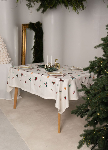 Розмір: 3,00*1,55 Колір: Молочний Склад: 75%Поліестер 22%Бавовна 3%Льон Скатертина «Різдвяна мелодія» дарує простору особливий настрій, огортаючи його теплом зимових свят. Її святковий візерунок — олені, мініатюрні ялинки, льодяники, подарунки, апельсинові скибки та гілочки падубу — створює живу картину, що наче зібрана з найсолодших моментів передріздвяного часу. Великий розмір скатертини — 3,00 × 1,55 метри — ідеально підходить для великих родинних застіль. Вона легко формує елегантний центровий акцент, додаючи сервіруванню завершеності та чарівності. Скатертина гармонійно поєднується з дерев’яними поверхнями, класичним посудом і святковими декораціями, наповнюючи кімнату атмосферою теплих зустрічей. Тканина з 75% поліестеру, 22% бавовни та 3% льону вирізняється приємною текстурою, стійкістю до зношення й невибагливістю у догляді. «Різдвяна мелодія» — це стильний штрих, який об’єднує простір і створює казковий настрій у найтепліші зимові дні.