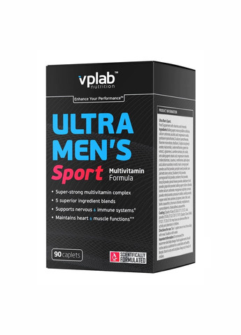 Наша унікальна високоактивна формула з 47 ключових поживних речовин оптимізована для чоловічого здоров'я, працездатності та життєвої сили. Високоміцна суміш із 47 ключових поживних речовин і активних інгредієнтів П'ять чудових сумішей інгредієнтів Підтримує чоловіче здоров'я, енергію та бадьорість Допомагає підтримувати правильну роботу м'язів 90 капсул, які легко проковтнути Ultra Blend - це унікальна комбінація необхідних вітамінів і мінералів, створена для вашого загального здоров'я та гарного самопочуття. Гострий розум, енергійне тіло Дозвольте енергійним вітамінам групи В діяти. Вони тут, щоб підтримувати повсякденну енергію та бадьорість і допомагати зменшити втому. А з Memory Blend ви отримаєте необхідну допомогу для збереження пам'яті, розумової діяльності та когнітивних і психологічних функцій там, де вони повинні бути. Підтримка імунітету та відновлення Імунітет, ти у нас є. Вітаміни A і D поєднуються з антиоксидантним захистом вітаміну E, а також високою дозою вітаміну C. Разом вони допомагають захистити вашу імунну систему навіть після інтенсивних фізичних вправ. Хочете швидкого одужання? Тут представлена ​​суміш амінокислот із сумішшю L-метіоніну, L-таурину, L-карнітину та L-глутаміну. Незамінні мінерали Сильне натискання означає повернення мінералів у ваше тіло. Ultra Men's Sport допомагає відновити необхідні мінерали, такі як магній, кальцій і залізо, які сприяють електролітному балансу, нормальній роботі м'язів і синтезу білка, транспорту кисню, а також підтримують міцність і здоров'я кісток. Гормональна підтримка Суміш фруктів і овочів тут для ваших гормонів і хімічного балансу тіла, з цинком для підтримки вашої фертильності, відтворення та рівня тестостерону, а також вітаміном B6, щоб допомогти регулювати гормональну активність. Суміш для здоров'я передміхурової залози підтримує здоров'я передміхурової залози на найвищому рівні завдяки таким інгредієнтам, як порошок з гарбузового насіння, лікопін і екстракт ягід пальмового дерева. Максимальне живлення, оптимізована продуктивність Ultra Men's Sport наповнений додатковими поживними речовинами та рослинними компонентами, створеними для максимального живлення та повної підтримки. Незамінні амінокислоти поєднані з унікальною сумішшю з 10 порошків фруктів і овочів, вибором потужних каротиноїдів і багатьом іншим. Інші інгредієнти Кукурудзяний крохмаль, кроскармелоза натрію, харчовий наповнювач (мікрокристалічна целюлоза), карбонат кальцію, L-аскорбінова кислота, оксид магнію, піридоксину гідрохлорид, d-пантотенат кальцію, мононітрат тіаміну, рибофлавін, d-альфа-токоферилацетат, нікотинамід, L-селенметионін, екстракт зеленого чаю, L-глютамін, L-карнітин тартрат, оксид цинку, засоби проти злежування (стеаринова кислота, стеарат магнію), бітартрат холіну, L-таурин, L-метіонін, альфа-ліпоєва кислота, кальцій-l-аскорбат, інозітол, ніацин, порошок із цедри апельсина, порошок із ягід асаї, порошок із насіння гарбуза, екстракт ягід сереної, порошок із плодів лохини, порошок із насіння гранату, порошок із плодів журавлини, порошок із броколі, порошок із листя шпинату, порошок із плодів бузини, екстракт шкірки винограду, наповнювач (діоксид кремнію), кошерний карбонат кальцію, сульфат марганцю, порошок із плодів томату, ретинілацетат, йодид калію, ванільний порошок, оболонка Opadry прозора, оболо