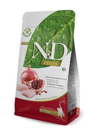 Беззерновий сухий корм для кошенят до 12 місяців Farmina N&D Prime Grain Free Kitten Chicken & Pomegranate Представлена лінійка кормів Farmina розроблена за участю провідних фахівців та вчених Італії, головне завдання яких полягало в тому, щоб створити не просто поживний, але й збалансований раціон, що допомагає зберігати здоров'я улюблених вихованців. Все в цьому кормі ідеально, починаючи від розміру гранул і закінчуючи їх вмістом, порадуйте вірного друга цими ласощами, і Ви побачите позитивні зміни, як у зовнішньому вигляді мурлики, так і в її поведінці. Дієтологічна система, заснована на природних особливостях представників чотирилапих тварин, Natural & Delicious Grain Free – система харчування для м'ясоїдних тварин без вмісту зернових культур та ГМО, понад 70% інгредієнтів якої складають по-справжньому високоякісні компоненти тваринного походження. Повнораціонний корм для кошенят призначений для малюків з моменту відлучення від материнського молока і до 12 місяців. Також харчування підходить для вагітних і годуючих кішок, які потребують більш поживного раціону. І якщо Беззернові корми для кошенят купити Курка в кормах для домашніх тварин - джерело легкозасвоюваного тваринного білка, який має найвищу біологічну цінність, і постачає всі необхідні амінокислоти в потрібних пропорціях. Картопля містить вітаміни групи B, вітамін С, багато калію, цинку, міді, заліза, магнію та інших поживних речовин. Пташиний жир - високоперетравлюване джерело незамінних Омега-6 жирних кислот, особливо лінолевої кислоти. Риб'ячий жир є джерелом енергії і Омега-3 жирних кислот, в тому числі ДГК (докозагексаєнової кислоти) і ЕПК (ейкозапентаєнової кислоти), для підтримки здорової шкіри і шерсті. Горох є відмінним замінником злаків, так як має більш низький глікемічний індекс, це якісне джерело рослинного білка, вуглеводів і клітковини. Яйця - одне з найцінніших джерел білка, яке засвоюється організмом котів та собак на всі 100%. Яйця також містять холін - поживну речовину, що відіграє важливу роль у функціонуванні клітин, у тому числі мозку, а також лютеїн та зеаксантин - антиоксиданти, які допомагають зберегти зір. Морква - найбагатше джерело клітковини, яка надає позитивний ефект на роботу шлунково-кишкового тракту тварини. Екстракт дріжджів містить вітаміни, ферменти і маннанові олігосахариди - пребіотики, які підтримують здорову, збалансовану мікрофлору кишечника, а також бета-глюкан - полісахариди, що стимулюють імунітет. Аналітичний склад корму Компонент Вміст протеїн 44,01% жир 20,01% зола 8,51% клітковина 1,81% кальцій 1,51% фосфор 1,31% магній 0,09% Омега-3 0,91% Омега-6 3,31% Склад корму для котів Фарміна Свіже м'ясо курки без кісток (30%), дегідратоване м'ясо курки (28%), картопля, курячий жир, дегідратовані цілісні яйця, свіжий оселедець, дегідратований оселедець, риб'ячий жир, гідролізат тваринного білків, волокна гороху, сушена морква, сушена люцерна, інулін, фруктоолігосахариди, маннанолігосахариди, порошок гранату (0,5%), дегідратовані яблука, порошок шпинату, подорожник (0,3%), порошок чорної смородини, дегідратований солодкий апельсин, порошок чорниці, хлорид натрію, пивні сухі дріжджі, корінь куркуми (0,2%), глюкозамін, хондроїтин сульфат, екстракт календули (джерело лютеїну). Вітаміни та мінерали: Вітамін А 18000МЕ; Вітамін D3 1200 МЕ; Вітамін Е 600мг; Вітамін З 300мг; Вітамін РР 150мг; Пантотенова кислота 50мг; Вітамін В