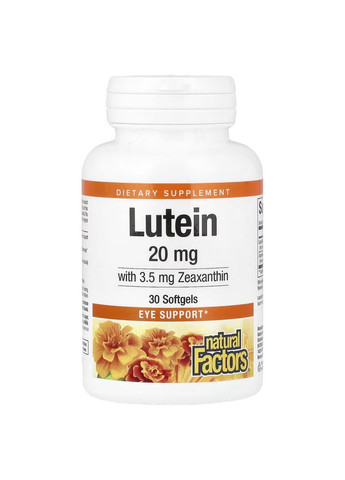 Лютеїн Lutein Natural Factors 20 мг 30 капсул — це натуральний каротиноїдний комплекс з лютеїном і зеаксантином, розроблений для підтримки зору, особливо в разі високого зорового навантаження, роботи за екраном, керування автомобілем і вікових змін. Формула підходить дорослим будь-якого віку, але особливо актуальна для тих, хто багато часу проводить за комп'ютером, скаржиться на сухість очей, зниження чіткості зображення або втому після читання і роботи з текстами. Лютеїн і зеаксантин — пігменти, які у великій кількості накопичуються в сітківці ока, насамперед у її центральній зоні — макулі. Ця область відповідає за гостроту зору, сприйняття деталей і кольорів. Лютеїн і зеаксантин виконують функцію світлового фільтра, захищаючи чутливі структури ока від впливу синього світла й ультрафіолету. Особливо важливо це під час постійної роботи за монітором, смартфоном, в умовах штучного освітлення і під час водіння в темний час доби. При регулярному прийомі лютеїн допомагає: знизити стомлюваність очей у разі тривалого зорового навантаження, поліпшити чіткість і контрастність зору, захистити очі від фотостаріння й окисного стресу, уповільнити вікові зміни в сітківці, включно зі зниженням щільності макулярного пігменту, зменшити дискомфорт у разі сухості очей, особливо в приміщеннях із кондиціонерами. Зеаксантин працює в парі з лютеїном, посилюючи його антиоксидантну дію і підтримуючи структуру макули. Разом вони допомагають зберегти зір у разі вікових змін, особливо у людей старше 40 років, а також за генетичної схильності до дегенерації жовтої плями. Лютеїн Lutein Natural Factors 20 мг 30 капсул — це точкова підтримка очей при цифровому навантаженні, в період зниження зорової функції або як частина регулярного догляду за зором у будь-якому віці. Особливо корисний тим, хто помічає зниження чіткості, частіше мружиться, відчуває втому очей або хоче зберегти зір під час роботи в напруженому ритмі. Рекомендації із застосування Приймати 1 капсулу на день під час їди або за рекомендацією лікаря. Состав Розмір порції: 1 капсула Порцій в упаковці: 30 Кількість в 1 порції % від добової норми Лютеїн LuteinRich™ (Tagetes erecta) (екстракт квіток чорнобривців) 20 мг ** Зеаксантин (Tagetes erecta) (екстракт квіток чорнобривців) 3,5 мг ** ** Добову норму не визначено. Додаткові інгредієнти: капсула (желатин, гліцерин, очищена вода, аннато, діоксид титану), сафлорова олія, органічна лляна олія, жовтий бджолиний віск, лецитин соняшника (без ГМО). Не містить: штучних консервантів, підсолоджувачів, молочних продуктів, крохмалю, цукру, пшениці, глютену, дріжджів, сої, яєць, риби, молюсків, солі, деревних горіхів, ГМО. Виготовлено компанією Natural Factors із гарантією безпеки й ефективності відповідно до стандартів належної виробничої практики (GMP), розроблених Управлінням із контролю якості харчових продуктів і лікарських засобів США й Міністерством охорони здоров’я Канади. Попередження Перед використанням слід проконсультуватися з лікарем, особливо під час вагітності, грудного вигодовування, за наявності будь-яких захворювань або під час прийому препаратів. Зберігати в недоступному для дітей місці. Продукт герметично упаковано з метою безпеки. Не використовуйте цей продукт, якщо захисна плівка пошкоджена. Зберігати в сухому та прохолодному місці для збереження свіжості.