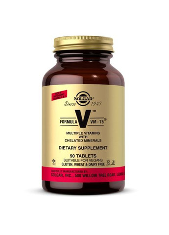 Formula V, VM-75 від Solgar - це мультивітамінно-мінеральний комплекс, що поєднує вітаміни, хелатні мінерали та рослинні компоненти для комплексної підтримки організму Розмір порції: 1 таблетка Кількість порцій: 60 Кількість в 1 порції % від добової потреби Вітамін A (бета-каротин) 2,2 ніацинамід, L-аскорбінова кислота) 250 мг 278% Вітамін D (ергокальциферол) 10 мкг (400 МО) 50% Вітамін E (d-альфа-токоферил сукцинату) 100,5 мг 670% Тіамін (5 мг 7 мг) 5,769% Ніацин (нікотинамід аскорбату) 75 мг 469% Вітамін B6 (піридоксин гідрохлориду) 75 мг 4,412% Фолат 666 мкг DFE (400 мкг фолієвої кислоти) 167% Вітамін B12 (ціонокобала) 75 мкг 250% Пантотенова кислота (d-пантотенат кальцію) 75 мг 1,500% Холін (бітартрат холіну) 31 мг 6% Кальцій (карбонат кальцію) 20 мг 2% Залізо (хелат бісгліцинат заліза) ** 1од 5 мкг 100% Магній (гліцинат, амінокислотний хелат, оксид магнію) 10 мг 2% Цинк (гліцинат, амінокислотний хелат, оксид цинку) 10 мг 91% Селен (L-селенометіонін) 25 мкг 45% Мідь (аміно 1 Марганець (амінокислотний хелат гліцинату) 1 мг 43% Хром (амінокислотний хелат нікотинату хрому) 25 мкг 71% Молібден (амінокислотний хелат гліцинату) 25 мкг 56% Калій (амінокислотний комплекс калію). 75 мг * Рутин 37,5 мг * Комплекс цитрусових біофлавоноїдів 25 мг * Бетаїну гідрохлорид 25 мг * Гесперидин 7,5 мг * Суміш у порошку (люцерна [листя та стебло], комплекс ацероли [плоди], петрушка [листя та стебло]-, * Бір (гліцинат бору) 0,5 мг * Суміш каротиноїдів (альфа та бета-каротин, лютеїн, лікопін, зеаксантин, криптоксантин) 86 мкг * * Добова потреба не визначена. ** Деякі добавки із залізом викликають подразнення шлунково-кишкового тракту та викликають запор. Ця унікальна форма хелатного заліза (бісгліцинату заліза) розроблена спеціально для того, щоб оптимізувати всмоктування та забезпечити дбайливий вплив на організм.
