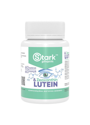 Харчова добавка Stark Pharm - Stark Lutein & Zeaxanthin містить лютеїн та зеаксантин, каротиноїди, які є природними пігментами, що сприяють захисту очей від пошкоджень, спричинених впливом вільних радикалів. Дія добавки: Нормалізація зорових функцій Захист сітківки ока від впливу вільних радикалів та шкідливої дії світла Підтримка гостроти і контрастності зору Уповільнення розвитку катаракти Одна капсула містить: Лютеїн (із екстракту квітів календули) - 25 мг Зеаксантин (із екстракту квітів чорнобривців) - 5 мг Додаткові компоненти: Мальтодекстрин Стеарат кальцію Желатинова капсула Рекомендації щодо застосування: Може бути рекомендована в якості харчової добавки. Продукт слід використовувати за рекомендацією тренера або за призначенням лікаря. Спосіб застосування: Дорослим по 1 капсулі на день. Вживайте після прийому їжі, запиваючи склянкою води.