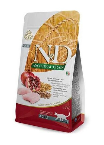 Низькозерновий сухий корм для дорослих котів та кішок Farmina N&D Prime Low Grain Cat Adult Chicken & Pomegranate Представлена лінійка кормів Farmina розроблена за участю провідних фахівців та вчених Італії, головне завдання яких полягало в тому, щоб створити не просто поживний, але й збалансований раціон, що допомагає зберігати здоров'я улюблених вихованців. Все в цьому кормі ідеально, починаючи від розміру гранул і закінчуючи їх вмістом, порадуйте вірного друга цими ласощами, і Ви побачите позитивні зміни, як у зовнішньому вигляді мурлики, так і в її поведінці. Дієтологічна система, заснована на природних особливостях представників чотирилапих тварин, Natural & Delicious Low Ancestral Grain – система харчування для м'ясоїдних тварин із вмістом понад 60% по-справжньому високоякісних інгредієнтів тваринного походження, кількох видів анцестральних зернових культур (спельта та овес) та вільних від ГМО. Сухий корм для дорослих кішок призначений для вихованців від 12 місяців із нормальною фізичною активністю. І якщо Сухі корми для дорослих кішок купити Курка в кормах для домашніх тварин - джерело легкозасвоюваного тваринного білка, який має найвищу біологічну цінність, і постачає всі необхідні амінокислоти в потрібних пропорціях. Пташиний жир - високоперетравлюване джерело незамінних Омега-6 жирних кислот, особливо лінолевої кислоти. Овес - джерело високоперетравлюваних вуглеводів, білка і живильної клітковини. Відрізняється низьким глікемічним індексом (40), тому корисний для діабетиків, літніх та вихованців з алергією. Спельта - злакова культура, але в порівнянні з пшеницею зерна спельти містять більше білка (від 27% до 37%), заліза та вітамінів групи В, а також менше глютену, який часто викликає у тварин алергію. Риб'ячий жир є джерелом енергії і Омега-3 жирних кислот, в тому числі ДГК (докозагексаєнової кислоти) і ЕПК (ейкозапентаєнової кислоти), для підтримки здорової шкіри і шерсті. Горох є відмінним замінником злаків, так як має більш низький глікемічний індекс, це якісне джерело рослинного білка, вуглеводів і клітковини. Яйця - одне з найцінніших джерел білка, яке засвоюється організмом котів та собак на всі 100%. Яйця також містять холін - поживну речовину, що відіграє важливу роль у функціонуванні клітин, у тому числі мозку, а також лютеїн та зеаксантин - антиоксиданти, які допомагають зберегти зір. Морква - найбагатше джерело клітковини, яка надає позитивний ефект на роботу шлунково-кишкового тракту тварини. Екстракт дріжджів містить вітаміни, ферменти і маннанові олігосахариди - пребіотики, які підтримують здорову, збалансовану мікрофлору кишечника, а також бета-глюкан - полісахариди, що стимулюють імунітет. Аналітичний склад корму Компонент Вміст протеїн 36,01% жир 20,01% зола 8,11% клітковина 1,91% кальцій 1,21% фосфор 1,11% магній 0,09% Омега-3 0,91% Омега-6 3,31% Склад корму для котів Фарміна Свіже куряче м'ясо без кісток (24%), дегідратоване куряче м'ясо (24%), спельта (10%), овес (10%), курячий жир, зневоднені цілісні яйця, свіжий оселедець, дегідратований оселедець, риб'ячий жир, гідролізат білка тваринного походження, пульпа цукрових буряків, горох, сушена морква, борошно люцерни, інулін, фрукто-олігосахариди, маннан-олігосахариди, порошок гранату (0,5%), сухі яблука, порошок шпинату, подорожник (0,3%), порошок зневоднений солодкий апельсин, порошок чорниці, хлорид натрію, пивні дріжджі, корінь куркуми (