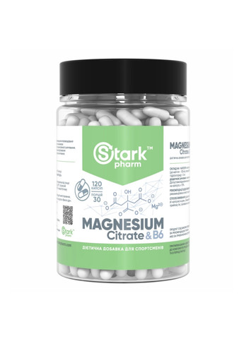 Магній & B6 Stark Magnesium Citrate & B6 Харчова добавка Stark Pharm - Stark Magnesium Citrate & B6 містить легкозасвоювану форму магнію, доповнену вітаміном B6. Магній є важливим мінералом, який відіграє ключову роль у ряді процесів в організмі людини. У природі основним джерелом магнію є листові овочі і горіхи. В достатній кількості магній підтримує правильне функціонування м'язів, підтримуючи електролітний баланс і здоров'я зубів і кісток. Магній допомагає зменшити втому, а також сприяє підтримці нормальних психологічних функцій. Крім того, магній підвищує поріг нервово-м'язової збудливості, зменшуючи неприємний дискомфорт, пов'язаний з надмірним скороченням м'язів (біль у м'язах і спазми, посмикування повік) і підвищує здатність до фізичних навантажень. Зверніть увагу, що магній вкрай необхідний нашому серцю. Недарма його вважають корисним при попередженні аритмії. Його позитивний вплив на скелетні м'язи виражається в зменшенні проявів нічних м'язових спазмів. Вітамін B6 сприяє функціям імунної системи, синтезу еритроцитів, правильному енергетичному обміну та стійкому гормональному балансу. Вітамін В6 (піридоксину гідрохлорид) сприяє кращому засвоєнню магнію до 20% у шлунково-кишковому тракті та покращує його доставку до клітин. Окрім цього, вітамін В6 захищає організм від шкідливих наслідків стресу, також він відіграє важливу роль у збереженні енергії в м'язових клітинах. Дія добавки: Нормалізація функціонування м'язів Підтримка електролітичного балансу Нормалізація синтезу білка Зменшення втоми Підтримка психологічних функцій Захист організму від шкідливих наслідків стресу Покращення стану кісток та зубів Підтримка серцево-судинної системи