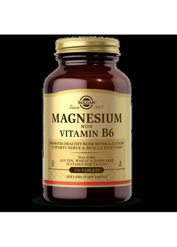 Основні переваги: Magnesium Vitamin B6 від Solgar Магній та вітамін B6 – це потужна комбінація, яка відіграє важливу роль у підтримці нервової системи та загального самопочуття Розмір порції: 3 таблетки Кількість порцій: 83 В одній порції % від добової потреби** Вітамін B6 (піридоксин гідрохлорид) 0,5 мг 95% ** Відсоток від добової потреби ґрунтується на дієті в 2000 калорій.