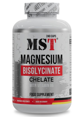 Магній бісгліцинат хелат з вітаміном В6 MST Magnesium Bisglycinate Chelate + B6 240 капс Магній бісгліцинат хелат з вітаміном В6 MST Magnesium Bisglycinate Chelate + B6 240 капс Magnesium Bisglycinate Chelate + B6 від MST - це високоефективна добавка з магнієм у хелатній формі та вітаміном B6, створена для підтримки нервової системи, зміцнення м'язів та кісток, а також покращення енергетичного обміну. Хелатна форма магнію відрізняється високою біодоступністю та легким засвоєнням організмом, що робить продукт максимально ефективним. Корисні властивості: Підтримка нервової системи: Магній та вітамін B6 допомагають справлятися зі стресом, покращують якість сну та підтримують емоційну рівновагу. Здоров'я м'язів і кісток: Магній сприяє скороченню та розслабленню м'язів, запобігає судомам та зміцнює кісткову тканину. Енергетичний обмін: Компоненти добавки беруть участь у виробленні енергії, допомагаючи боротися зі втомою. Хелатна форма магнію: Забезпечує найкраще засвоєння та мінімізує дискомфорт з боку шлунка. Синергія з вітаміном B6: Покращує засвоєння магнію та посилює його вплив на організм. Підходить для активного способу життя: Допомагає відновитись після фізичних навантажень та покращує витривалість. Профілактика дефіциту магнію: Ідеальний для людей із підвищеними навантаженнями, стресом чи незбалансованим харчуванням. Без зайвих добавок: Формула не містить цукру, глютена та ГМО. Склад в одній порції (1 капсула): Калорії – 2 ккал Жири <0.5 г (- насичені <0.1 г) Вуглеводи <0.5 г (цукор <0.5 г) Харчові волокна <0.5 г Білок <0.5 г Сіль <0.01 г Вітамін В6 (піридоксин гідрохлорид) – 1.4 мг Магній (бісгліцинат) – 90.2 мг Інгредієнти: Бісгліцинат магнію, гідроксипропілметилцелюлоза, розділовий агент (магнієві солі жирних кислот), піридоксину гідрохлорид. Рекомендації щодо застосування Приймайте по три капсули на день, не розжовуючи, запиваючи невеликою кількістю води під час їжі.