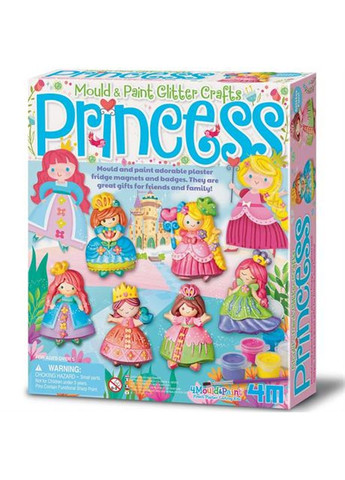 Кожна дівчинка мріє бути принцесою. Саме час вигадати кілька образів, примірявши їх на шести різних фігурках! За допомогою набору для творчості від 4М ви створите оригінальні прикраси і магніти у вигляді милих принцес. Здивуйте маму, сестру або подружок унікальним сувеніром ручної роботи! Зроби і розфарбуй – що може бути цікавіше? Розведіть гіпсовий порошок у потрібних пропорціях, залийте у форми і прикріпіть зверху булавки, якщо хочете отримати брошки. Дочекайтеся застигання маси, витягніть фігурки принцес із форм і починайте розфарбовувати. Використовуйте кольори з набору або створюйте свої відтінки за підказками в інструкції. Посипте принцес блискітками на свіжу фарбу, щоб вони чарівно виблискували, коли висохнуть! Для створення магнітів, розріжте магнітну смужку на шматочки, зніміть захисну плівку з клейкого боку і щільно притисніть до гіпсової фігурки. Швидше вішайте магніт на холодильник – такого більше немає ні в кого! Деякі набори з серії Mould & Paint містять замість блискіток фарби, що світяться в темряві. Зберіть колекцію неповторних аксесуарів, зроблених власноруч! Набір для творчості підійде дівчатам від 5 років. Він розвиває уяву, дрібну моторику, колірне сприйняття, впевненість у здібностях, художні навички. У наборі: Пакетик із гіпсом – 1 шт. Пакетик із блискітками – 1 шт. Булавки – 2 шт. Магнітна смужка – 1 шт. Шаблон із 6 формами – 1 шт. Пензлик – 1 шт. Набір фарб – 1 шт.