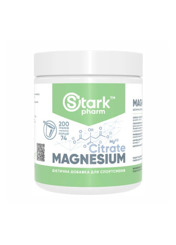 Харчова добавка Stark Pharm - Stark Magnesium Citrate містить магнію цитрат у формі порошку. Магній є життєво важливим елементом, знаходиться у всіх тканинах організму, має вирішальне значення для виробництва енергії та метаболізму, скорочення м'язів, передачі нервових імпульсів та мінералізації кісток. Крім того, магній також корисний для судин та артерій. Спортсмени оцінять допомогу цього мінералу у розслабленні м'язів та емоційному заспокоєнні, що сприяє швидкому відновленню після тренувань. За рахунок свого заспокійливого ефекту, магній посилює захист організму та перешкоджає передчасному старінню. Має жовчогінну та сечогінну дію, що сприяє очищенню організму від шкідливих речовин і покращує роботу нирок. Дія добавки: Підтримка нервової системи Зняття стресу Підтримка пам'яті та концентрації Нормалізація артеріального тиску Поліпшення обміну речовин та виробництва клітинної енергії Прискорення метаболізму вуглеводів, жирів та жирних кислот Підвищення функціональності та скорочувальної здатності м'язів Підтримка правильного розслаблення та скорочення гладкої та скелетної мускулатури