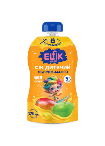 Дитячий сік Elfik Magic (Елфік Мейджик) Яблуко-Манго – це яскраве поєднання смаку соковитого яблука та екзотичного манго, яке подарує справжню насолоду кожному маленькому гурману. Завдяки насиченому фруктовому аромату напій не лише освіжає, але й піднімає настрій. Він створений із турботою про дітей, використовуючи тільки натуральні інгредієнти, щоб забезпечити користь і безпеку. Сік стане чудовим вибором для смачних перекусів або доповнення до основного прийому їжі, даруючи організму заряд вітамінів та енергії. Це ідеальний спосіб познайомити малюка з новими смаками та прищепити любов до корисних напоїв. Основні переваги: смачний комбінований сік з яблука та манго упаковка no spill-pack для запобігання проливанню ідеальний для дітей, завдяки безпечній та зручній упаковці натуральний склад без штучних добавок зручний об’єм 175 мл підходить для дитячих перекусів Важлива інформація: найкращим харчуванням для дітей грудного віку є материнське молоко. Перед початком прикорму проконсультуйтеся з лікарем-педіатром. Рекомендації щодо споживання: рекомендовано дітям з 5-ти місячного віку. Спосіб споживання: починати з 0.5 чайної ложки двічі на день, до 12 місяців збільшити кількість до 100 мл на день. Умови зберігання: до розкриття герметичної упаковки, зберігати за температури від 0 °С до плюс 25 °С і відносної вологості повітря не більше 75 %. Берегти від попадання сонячних променів. Після відкриття упаковки зберігати у холодильнику з закритим ковпачком протягом доби. Термін придатності: 12 місяців від дати виробництва. Дату виробництва та «Вжити до» вказано на нижній частині упаковки. Характеристики Об'єм: 175 мл Виробник: Elfik Magic, Україна. Рекомендовано для дітей з 5 місяців.