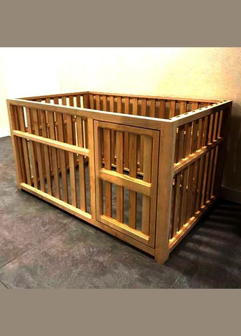 Дерев’яний вольєр для цуценят - це конструкція, яка забезпечить безпеку домашніх улюбленців, особливо дрібних порід, і допоможе захистити інтер'єр квартири від зубів і кігтів. Домашні улюбленці часто відчувають стрес, хоча господарі звикли вважати це поняттям, що відносяться тільки до людської психіки. Наприклад, щеня відчуває стрес в новому будинку: він позбавляється матері, а навколо незвична обстановка. Дорослі особини можуть мати потребу в особистому просторі і спокої, це стосується вагітних або самок що тільки народили. Іноді в ізоляції потребує хворий пес, якому необхідний комфорт, але в той же час його потрібно захистити від будь-яких контактів. У таких випадках необхідний вольєр або манеж для домашніх улюбленців. Розміри зовнішні: висота - 70см, глибина - 100см, ширина - 120см. Матеріал: дерево. Покриття: рідкий віск. Виріб ручної роботи та виготовлений виключно з натуральних, екологічно чистих матеріалів.