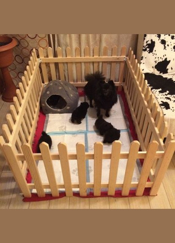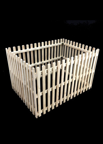 Дерев’яний вольєр для цуценят - це конструкція, яка забезпечить безпеку домашніх улюбленців, особливо дрібних порід, і допоможе захистити інтер'єр квартири від зубів і кігтів. Домашні улюбленці часто відчувають стрес, хоча господарі звикли вважати це поняттям, що відносяться тільки до людської психіки. Наприклад, щеня відчуває стрес в новому будинку: він позбавляється матері, а навколо незвична обстановка. Дорослі особини можуть мати потребу в особистому просторі і спокої, це стосується вагітних або самок що тільки народили. Іноді в ізоляції потребує хворий пес, якому необхідний комфорт, але в той же час його потрібно захистити від будь-яких контактів. У таких випадках необхідний вольєр або манеж для домашніх улюбленців. Розміри зовнішні: висота - 50см, глибина - 110см, ширина - 110см. Матеріал: дерево. Покриття: рідкий віск. Виріб ручної роботи та виготовлений виключно з натуральних, екологічно чистих матеріалів.