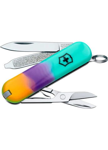 Серія малих швейцарських ножів VICTORINOX містить мініатюрні моделі (58 мм), які можна використовувати як брелок для ключів, що робить їх корисними та зручними в повсякденному житті. Більшість ножів з цієї серії забезпечені ножицями та манікюрною пилкою, що дає змогу використовувати їх як дорожній манікюрний набір. Ножі-брелоки VICTORINOX мають широку колірну гамму і відмінно підійдуть прекрасним аксесуаром як для чоловіків, так і для жінок і дітей. Окрім класичних, моделі мають варіанти накладок з національною символікою, створені в підтримку України. Модель Classic SD – це один із найменших швейцарських ножів-брелоків від відомої компанії Victorinox. Габарити в складеному вигляді становлять 58 мм, що дозволяє розмістити ніж у кишені або підвісити на ключі. Попри невеликий розмір, модель отримала клинок із нержавіючої сталі, який не поступається функціональністю більш габаритним побратимам. Ножиці та пилка для нігтів завжди допоможе підтримувати в бездоганному вигляді ваші нігті. До того ж кінчик пилки можна використовувати як пласку викрутку. Пінцет і зубочистка ховаються у руків’ї ножа та в потрібний час можуть стати у пригоді. Кільце на торці дозволяє підвісити ніж разом з ключами, або прикріпити до нього темляк. Підсерія Alox з алюмінієвими руків'ями поставляється без пінцета та пластикової зубочистки. Набір інструментів, що входять до багатоцільового ножа Victorinox Classic SD: - Лезо; - Ножиці; - Пилка для нігтів з пласкою викруткою 2,5 мм; - Кільце для підвісу; - Пінцет (тільки в моделях з пластиковими накладками); - Зубочистка (тільки в моделях з пластиковими накладками) ;