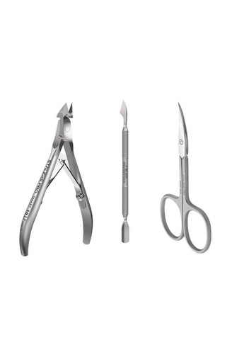 У набір входить: Кусачки STALEKS SMART професійні для шкіри 10 7 мм (Артикул: NS-10-7). Лопатка STALEKS SMART манікюрна (округлений пушер + топірець) (Артикул: PS-50/2). Ножиці STALEKS SMART професійні для кутикули 22 TYPE 1 (Артикул: SS-22/1). Набір Staleks SMART — це універсальний комплект, який забезпечує повний цикл підготовки та обрізання кутикули. Завдяки компактним кусачкам (7 мм) та точним ножицям Type 1 він ідеально підходить для тонкої та середньої кутикули та ефективного комбінованого манікюру. Ювелірна Точність: Компактні кусачки з робочою частиною 7 мм забезпечують чистий зріз та мінімізують ризик травмування. Повна Підготовка: Лопатка (округлений пушер + топірець) ідеально підходить для відсування та очищення нігтьової пластини. Тонкий Зріз: Ножиці Type 1 з тонкими вигнутими лезами забезпечують м'який та рівний зріз. Надійність: Медична сталь та ручне заточування гарантують довговічність та стійкість до стерилізації. Зручність: Інструменти лінійки SMART розроблені для максимального комфорту майстра. Набір інструментів Staleks SMART 3-в-1 — це функціональний комплект, розроблений для професійного манікюру та роботи з різними техніками обробки кутикули. Кусачки для шкіри (7 мм): Артикул NS-10-7. Кусачки мають коротку ріжучу частину (7 мм). Вони ідеальні для точкової, ювелірної роботи, видалення дрібних задирок та філігранного завершення манікюру. Лопатка манікюрна SMART (Округлений Пушер + Топірець): Артикул PS-50/2. Двостороння лопатка з лінійки SMART. Включає округлений пушер для акуратного відсування кутикули та гострий топірець для ретельного очищення птеригія та роботи в бічних пазухах. Ножиці для кутикули (Type 1): Артикул SS-22/1. Професійні ножиці, які мають тонкі, вигнуті леза. Модель Type 1 ідеально підходить для роботи з тонкою та середньою кутикулою, забезпечуючи плавний та чистий зріз. Усі інструменти виготовлені з високолегованої медичної сталі, що гарантує їхню стійкість до корозії та високих температур стерилізації.