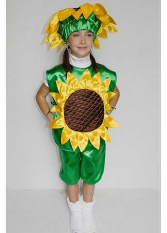 Дитячий карнавальний костюм «Соняшник». Основна тканина: атлас; Наповнювач: синтепон. Виміри: Довжина манішки – 46 см (всі розміри); Ширина манішки – 34 см (всі розміри); Довжина штанів – 44 см (1 розмір); 47 см (2 розмір); 50 см (3 розмір); Ширина штанів – 35 см (1 розмір); 39 см (2 розмір); 43 см (3 розмір). Комплектація: штани на гумці; манішка на зав'язках, доповнена аплікацією у вигляді соняшника; шапка на резинці для фіксації.