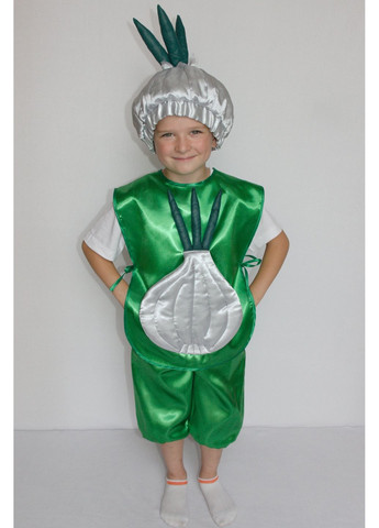 Дитячий карнавальний костюм «Часник». Основна тканина: атлас; Наповнювач: синтепон. Виміри: Довжина манішки – 46 см (всі розміри); Ширина манішки – 34 см (всі розміри); Довжина штанів – 44 см (1 розмір); 47 см (2 розмір); 50 см (3 розмір); Ширина штанів – 35 см (1 розмір); 39 см (2 розмір); 43 см (3 розмір). Комплектація: штани на резинці; манішка на зав'язках, доповнена аплікацією у вигляді часнику; шапка на резинці для фіксації.