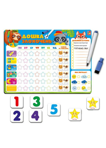 Робіть замітки та відзначайте виконані завдання малюка за допомогою «Дошки заохочень»! Набір містить дошку, яку можна розмістити на будь-якій магнітній поверхні, а також додаткові магнітики з цифрами. Проставляйте плюсики та записуйте на дошці важливу інформацію за допомогою багаторазового маркера «Пиши та витирай». Коли завдання тижня будуть виконані, витирайте старі написи та робіть нові замітки! Не забувайте підбивати підсумки в кінці кожного тижня! Комплектація: фігурний планер на магнітній основі, маркер «Пиши-витирай», 7 магнітів. Характеристики: Габарити: довжина: 31 Габарити: ширина: 23 Габарити: висота: 2 Стан: нове Вікова група: Від 3 років Матеріал: Комбінований Тип: Магнітні Колір: Різні кольори Упаковка: пакет Вид: Дошка для малювання Вік: Від 3-х років Гарантія: 14 днів Стать: унісекс Країна реєстрації бренду: Україна Країна-виробник товару: Україна