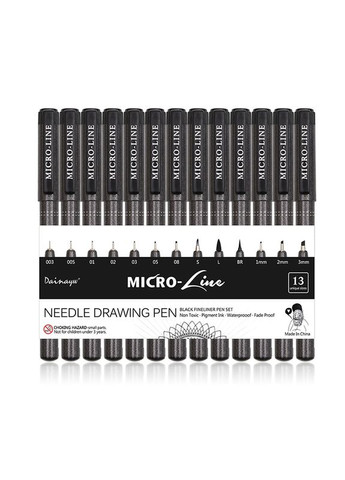 Рапідограф, він же лінер, лайнер, рейсфедер, капілярна ручка, японський маркер, креслярський маркер - ручка для каліграфії та точних креслярських робіт. Виключно зручний, який малює чіткими тонкими лініями розміром від 0.03 мм. до 3 мм. Одноразові рапідографи заправлені пігментними (архівними) чорнилом, які не тріскаються і не вигоряють. Використовується архітекторами, художниками - графіками, картографами, інженерами, оформителями, дизайнерами, ілюстраторами, студентами і вчителями. Характеристики Виробник: Dainayw Країна виробник Китай Тип ручки Капілярна Тип чорнила Водні Кількість в наборі 13 Колір чорний Розмір: 003,005. 01. 02. 03. 05. 08. Л. с. бр. 1 мм. 2 мм. 3 мм