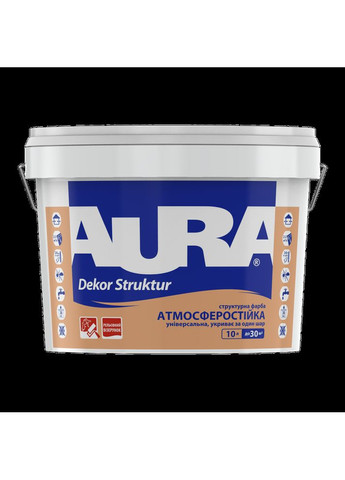 Властивості Готова до застосування структурна акрилатна фарба для фасадів та інтер'єрів. Утворює матове рельєфне покриття з дрібним візерунком. Наноситься валиком. Легко розкочується. Має хорошу адгезію до основи. Стійка до атмосферних і механічних впливів. Добре вкриває поверхню, приховуючи дрібні нерівності. Має хороші водовідштовхувальні властивості та паропроникність. Можливе застосування для оздоблення інтер'єру не тільки як самостійний матеріал, але і в різних поєднаннях (в комплексі) з іншими декоративними лакофарбовими матеріалами (шпаклівками, лаками, лазурами, гладкими фарбами). Остаточну стійкість до стирання покриття набуває через 4 тижні. Вміст ЛОС (леткі органічні сполуки) відповідає директиві Європейського Союзу 2004/42/ЄC. Призначення Створення декоративно-захисного покриття фасадів та інтер'єрів. Типи поверхонь під фарбування Бетон, легкий бетон, міцна цементно-вапняна штукатурка, азбоцемент, силікатна цегла, гіпсокартон. Стандарти якості КЛАСИФІИКАЦІЯ ЗГІДНО СТАНДАРТУ ДСТУ EN 1062-1:2012. EN 1062-1:2012 | E4 | S3 | V2 | W2 | A0 | С0. Підготовка поверхні перед фарбуванням Офарблювана поверхня повинна бути сухою, чистою і міцною. Забруднення, відшарування, неміцні ділянки, що обсипаються, і речовини, що знижують адгезію фарби до основи (висоли, пил, жири, мастила тощо), ретельно видалити. Тріщини і вибоїни розшити і закрити відповідним ремонтним розчином або шпаклівкою. Пористі поверхні, або поверхні, що порошать, перед фарбуванням обробити ґрунтовкою ТМ Aura або ТМ Eskaro. Поверхню, раніше пофарбовану емалевою чи олійною фарбою, обробити наждаковим папером до матовості, очистити від покриття, що відшаровується, і утворилася пилу. Свіжі вапняно-цементні поверхні слід витримати перед фарбуванням не менше одного місяця. Місця на фасаді, уражені цвіллю або мохом, повинні бути ретельно очищені механічно і оброблені засобом BIOTOL (або BIOTOL Spray) і висушені. Для зниження витрат і збільшення покривності фарби Aura Dekor Struktur mini рекомендується перед фарбуванням нанести 1 шар ґрунтувального матеріалу. Як ґрунтувальний матеріал використовувати адгезійну ґрунтовку Aura Dekor Grund, фарби Aura Fasad або Aura Fasad Expo, а усередині приміщень ще й фарбу Aura Mattlatex. У разі використання тонованої фарби Aura Dekor Struktur mini необхідно затонувати ґрунтувальний матеріал в колір фінішного покриття. Нанесення Перед застосуванням перемішати. Перед фарбуванням великих площ тонованою фарбою змішати достатню кількість фарби в одній ємності. Основний спосіб нанесення фарби - спеціальним поролоновим фактурним валиком. У разі нанесення фарби фактурним валиком досить нанесення одного шару ґрунтувального матеріалу і одного шару структурної фарби Aura Dekor Struktur mini. Допускається застосування безповітряного розпилювача (діаметр сопла не менше 2 мм). При оздоблювальних роботах на невеликих ділянках поверхні фарби можливе створення нескладної структурної поверхні шаром до 1 мм за допомогою кельми, шпателя, гладилки, пензля та інших інструментів. При цьому витрата матеріалу збільшується в залежності від виду візерунка. Відкритий час роботи з фарбою - 15 хвилин. Під час нанесення та висихання фарби температура повітря, матеріалу та основи повинні бути не нижче +10°С. Не наносити фарбу за високої (вище 30°С) температури повітря, під прямими сонячними променями, а також під час дощу і туману без застосуван