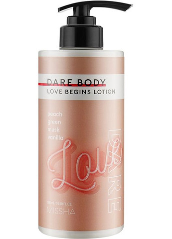 Любов починається! Саме це стверджує бренд Missha, доводячи, що догляд за тілом - справжнє задоволення. Зволожувальний лосьйон для тіла Love Begins доведе вам це. В основі збалансованої формули - масло ши, кераміди і мадекасозид, тому дія засобу направлена на зволоження і пом'якшення. Продукт має приємний фруктово-квітковий аромат з акордами грейпфрута, персика, троянди, жасмину мускусу, ванілі і сандалового дерева, що робить його застосування приємніше. Особливості Dare Body Moisture Lotion Love Begins від бренда Missha: - легка консистенція швидко всотується; - не залишає неприємної липкості; - пом'якшує і глибоко живить; - підтримує в нормі оптимальний баланс зволоження ; - запобігає трансепідермальну втрату вологи; - заспокоює шкірний покрив; - відновлює захисний бар'єр епідермісу; - стимулює аквапоріни - водорегулювальні білки, які знаходяться у клітинних мембранах; - підходить для шкіри, схильної до чутливості.