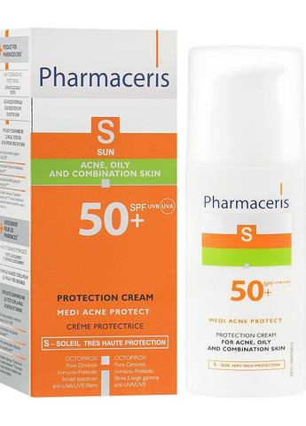 Шкіра, схильна до акне, вимагає особливого захисту від сонця! Саме тому в рамках серії Pharmaceris S разом із дерматологами було розроблено сонцезахисний крем Medi Acne Protect SPF50. Засіб не лише блокує агресивну дію сонячних променів, а й дарує шкірі оптимальний рівень вологи, нормалізує роботу сальних залоз, чинить антибактеріальний ефект і матує шкіру на 10 годин. Ефективність крему Pharmaceris S Medi Acne Protect SPF50 доведена 2-тижневим тестуванням in vivo на шкірі, схильній до жирності та утворення вугрів: надійний захист від UVA/UVB випромінювання, менше жирного блиску, підвищена антибактеріальна активність, на 92 % зволожена шкіра. Особливості Pharmaceris S Medi Acne Protect Cream SPF50: - клінічно та дерматологічно протестована формула для проблемної, схильної до акне та чутливої шкіри;- безпечний для водного середовища;- високий рівень захисту від сонця – SPF50;- рекомендований для людей, які пройшли лікування від акне, а також після косметологічних чи фармакологічних процедур;- формула з октопіроксом з потужними антибактеріальними та протисеборейними властивостями;- комплекс Immuno-Prebiotic відновлює правильний мікробіом шкіри;- технологія Pore-diminish звужує пори;- знижує до мінімуму ризики утворення опіків, подразнення та сонячних висипів;- нормалізує роботу сальних залоз, зберігаючи матову шкіру;- має гелеподібну текстуру для комфортного покриття.