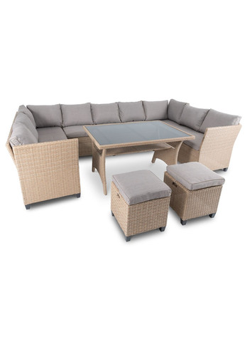 Бажаєте провести час з друзями чи родиною на природі? Набір меблів Rossano від Di Volio - буде чудовим вибором! Він ідеально підходить не лише для саду, а й легко розміститься на великому балконі чи терасі. Набір складається з 6-місного кутового дивану, крісла, великого столу та 2-х пуфів. Великий диван можна розкласти на два окремих 3-місних. Завдяки використанню якісного техноротангу, плетені меблі Rossano забезпечать вам естетичну насолоду, комфорт та зручність! Диван, крісло та пуфи оснащені м'якими зручними подушками. Теплий колір техноротангу надає інтер'єру додаткового затишку. Основні характеристики: Виробник: Di Volio Модель: ROSSANO DV-042GF Колір ротанга: бежевий Колір подушок: світло-сірий Плетений техноротанг Сталевий каркас Стільниця із загартованого скла товщиною 5 мм Розміри столу (Д x Ш x В): 145 x 75 x 67см Розміри крісла (Д x Ш x В): 70 x 72 x 73см Довжина куточка по спинці: 180 х 240см Висота до підлокітника: 62см Глибина сидіння: 58см Розміри пуфів (Д x Ш x В): 41 x 41 x 39см Товщина подушки сидіння: 8см Висота ніжок: 6,5см Чохли для подушок на блискавці з просоченого водовідштовхуючого матеріалу У комплект входять роз'єми для кріплення Стійкість до погодних умов: Так Стійкість до УФ-променів: Так Набір меблів, призначений для самостійної збірки. Досконале виконання Меблі Di Volio - це особливий клас. Комплект Rossano має міцну сталеву конструкцію, яка забезпечить стабільність і довговічність протягом багатьох років. Логотип Di Volio вигравіруваний на елегантних металевих пластинах. Довговічність техноротангу Садові меблі Rossano досить просто зібрати власноруч, вони легкі та практичні. Плетіння з техноротангу виконане за спеціальною технологією, тому цей матеріал дуже легко очищується, стійкий до погодних умов та ультрафіолетових променів. Зручні подушки До набору входять подушки на сидіння та спинки, товщиною 8см. Матеріал, з якого виготовлені подушки, - високоякісна поліефірна пряжа, міцний і водночас дуже приємний на дотик матеріал. Він додатково просочений спеціальним водовідштовхуючим розчином, тому випадкові плями буде легше видалити. Чохли для подушок оснащені прихованою блискавкою, що дозволяє швидко та зручно знімати їх для прання. Високий стіл Стіл у комплекті Rossano досить великий, а тому ідеально підійде для сімейних обідів або зустрічей з друзями. Стільниця виготовлена із загартованого скла, стійка до ушкоджень та дуже легко миється. Комплект виготовлений за новим сучасним дизайном, а тому враховано не лише практичність та зручність матеріалів, а й високу ергономічність: набір не займає багато місця та зручно складається.