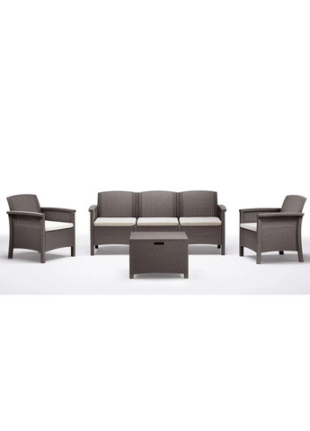 Комплект садових меблів Keter Salemo set — це практичне й естетичне рішення для організації зони відпочинку на терасі, балконі або в саду. Виготовлений із міцного пластику з текстурою під ротанг, комплект не боїться вологи, сонячного проміння й не потребує складного догляду. Меблі розраховані на комфортне розміщення до чотирьох осіб. Зручні подушки та продумана ергономіка забезпечують хорошийкомфорт. Стіл-скриня з кришкою — не лише стильний елемент, а й практичне місце для зберігання подушок, пледів та інших аксесуарів. Меблі легко збираються, відзначаються довговічністю та надійністю. Особливості Корпус виготовлений із високоякісного пластику з імітацією ротангового плетіння, стійкого до погодних умов; У комплект входять два крісла, двомісний диван і стіл із відсіком для зберігання речей; Усі елементи мають міцну конструкцію та витримують навантаження до 110 кг на посадкове місце; Зручні подушки в комплекті забезпечують додатковий комфорт під час тривалого сидіння; Колір меблів — капучино з піщаним відтінком — хорошо поєднується з природним оточенням та іншими елементами екстер’єру; Меблі не вицвітають на сонці й не схильні до корозії, оскільки не містять металевих елементів; Комплект легко збирається без додаткових інструментів і підходить для самостійного встановлення. Варіанти використання Створення затишної зони відпочинку на дачі, в саду або на терасі для всієї родини та гостей; Організація комфортної лаунж-зони в кафе, на верандах або біля басейну; Зберігання подушок та інших речей у столику-скрині для економії простору; Використання в умовах постійного перебування на вулиці завдяки стійкості до УФ-променів і вологи; Набір пластикових меблів можна використовувати в житлових комплексах, на базах відпочинку та в літніх ресторанах як функціональні та презентабельні меблі. *Реальний колір товару може дещо відрізнятися від зразків, представлених на сайті, залежно від технічних налаштувань вашого екрану, а також, зважаючи на особливості матеріалу, відтінок може змінюватися залежно від освітлення.