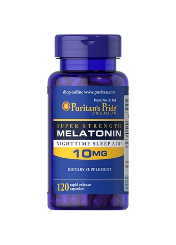 Puritan's Pride Мелатонін 10 мг - 120 таблеток Дієтична добавка. Не є лікарським засобом. Опис - Допомагає покращити якість відпочинку. - Поживна речовина підтримує міцний сон. - Засинай швидше, спи довше. - Містить 120-денний запас капсул швидкого вивільнення. - Puritan's Pride® Super Strength Melatonin Nighttime Sleep Aid* 10 мг містить: 120 капсул швидкого вивільнення. - Мелатонін - це гормон, який природним чином виробляється в організмі. Мелатонін бере активну участь у природному циклі сну. - Оскільки неефективний сон може вплинути на вашу енергію та настрій, мелатонін є чудовим вибором, якщо ви час від часу відчуваєте безсоння чи часовий лаг, або якщо ви хочете покращити якість відпочинку. - Мелатонін допомагає вам швидше заснути та довше спати. - Якщо приймати перед сном, мелатонін може підтримувати артеріальний тиск у межах норми. Вплив мелатоніну на артеріальний тиск може сприяти спокійному сну та розслабленому настрою.