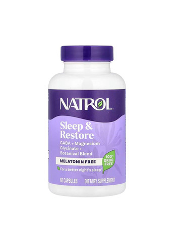 Natrol, засіб для сну та відновлення, без мелатоніну, 60 капсул Дієтична добавка. Не є лікарським засобом. Опис Без мелатоніну ГАМК і магній Гліцинат і рослинна суміш Не містить медикаментів Для кращого нічного сну Дієтична добавка Добавка для сну та відновлення Natrol® створена для кращого нічного сну — запоруки гарного відпочинку наступного дня. ГАМК покращує якість сну та сприяє швидшому засипанню (через тиждень). Магній — важливий мікроелемент, який допомагає організму розслабитися та підтримує здоровий сон. Виготовлено з рослинної суміші вишні, меліси та ромашки. Поживна цінність Розмір порції: 2 капсули Порцій в упаковці: 30 Кількість в 1 порції % від добової норми Вітамін B6 (у вигляді піридоксину гідрохлориду) 10 мг 588 % Магній (у вигляді гліцинату магнію) 100 мг 24 % ГАМК (гамма-аміномасляна кислота) 100 мг * Рослинна суміш екстракт плодів вишні (Prunus cerasus) Екстракт меліси лікарської (Melissa officinalis) (надземні частини), екстракт ромашки ромашка (Matricaria hamomilla) (квітка). 25 мг * * Добову норму не визначено. Рекомендації із застосування Дорослим приймати по 2 капсули за 20–30 хвилин до сну. Інші інгредієнти Мікрокристалічна целюлоза, капсула (гіпромелоза), стеарат магнію, діоксид кремнію. Не містить молока, яєць, риба, молюски й ракоподібні, деревні горіхи, арахіс, пшениці, соя, інгредієнти з кунжутом.