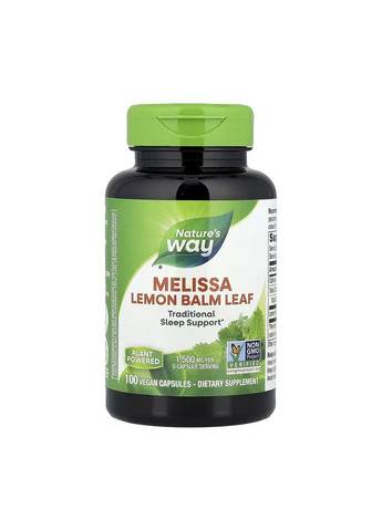 Melissa від Nature's Way – це дієтична добавка, створена на основі листя меліси лікарської, відомої як лимонний бальзам Порція: 3 капсули Порцій в упаковці: 33 В одній порції % від добової потреби ** Калорії 5 Всього вуглеводів <1 г <1% Всього цукру <1 г * Включає 0 г доданих цукрів 0% Мелісса (листя) 1,5 г (1500 мг) * ** Відсоток від добової потреби заснований на дієті в 2000 калорій. * Добова потреба не визначена.