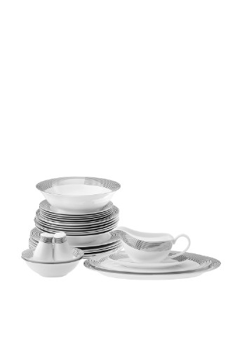 столовий сервіз виготовлений з кістяного порцеляни - матеріалу, який відрізняється особливою вишуканістю. Вироби з нього мають тонкі стінки, які навіть просвічуються. Цей вид порцеляни називають білим золотом. При легкому постукуванні ви можете почути мелодійний звук. Елементи сервізу декоровані ненав'язливим візерунком і смужками по краю тарілок. Сервіз з кістяного порцеляни стане чудовим подарунком на новосілля або річницю весілля. Всі елементи можна купити окремо. У набір входять 23 предмета: 1.Тарілка обідня, діаметр 26 см (6 шт.). 2. Тарілка глибока, діаметр 23 см (6 шт.). 3. Тарілка десертна, діаметр 20,5 см (6 шт.). 4. Супниця, об'єм 600 мл (1 шт.). 5. Блюдо, довжина 36 см (1 шт.). 6. Блюдо, довжина 23 см (1 шт.). 7. Салатник, діаметр 16 см (2 шт.)