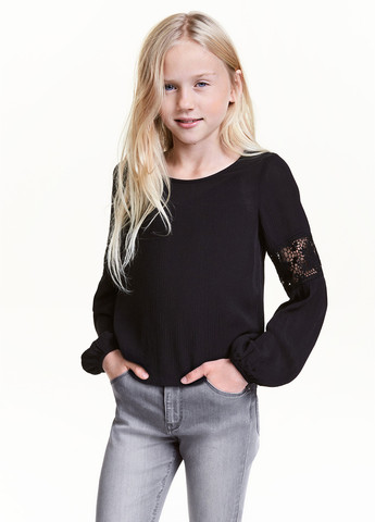 Топ з довгим рукавом із жатої віскозної тканини із спинкою, що запахається. Широкі рукави з мереживними вставками та вузькою гумкою знизу.
