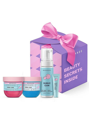 Жіночий подарунковий набір косметики для догляду за тілом Mermade Bubble Gum Party - гель і пінка для душу, бальзам для губ, цукровий скраб для тіла Набір доглядової косметики для тіла з ароматом фруктової жуйки Bubble Gum - те, що перетворює красивих дівчат на крутих! У наборі — 4 косметичні засоби, які зроблять вашу шкіру шовковистою та гладенькою. Ви почнете отримувати задоволення від б'юті-рутини вже тоді, відкриєте перший флакон! Приголомшливий фруктовий аромат жуйки підійме ваш настрій і викличе бажання розважатися весело, як у дитинстві! У наборі Bubble Gum Party від українського бренду косметики Мермейд ви знайдете: пінку для душу Mermade Bubble Gum, 150 мл; зволожуючий бальзам для губ Mermade Bubble Gum, 10 мл; цукровий скраб для тіла Mermade Bubble 250 г; гель для душу слаймовий Mermade Bubble Gum 200 мл.