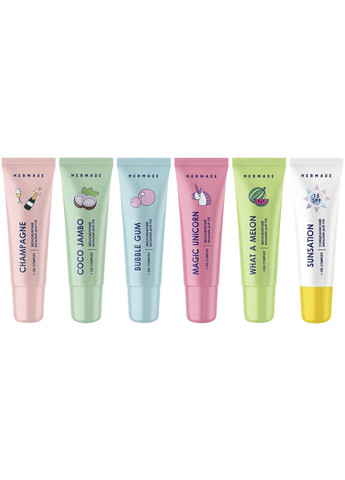 Сет бальзамів для губ Mermade Sweet kisses - це ідеальне рішення для забезпечення ніжного догляду за вашими губами в будь-який час і в будь-якому місці. У наборі: зволожувальний бальзам для губ Mermade Bubble gum; зволожувальний бальзам для губ Mermade Champagne; зволожувальний бальзам для губ Mermade Coco Jambo; зволожувальний бальзам для губ Mermade Magic Unicorn; зволожувальний бальзам для губ Mermade What a melon; сонцезахисний бальзам для губ Mermade Sunsation SPF 15. Основні переваги та особливості: має ніжну густу текстуру, що довго тримається на губах; не розтікається і не надає відчуття зайвої липкості; компактні розміри роблять їх зручними для використання, щоб завжди мати під рукою ідеальний догляд; також до набору входить бальзам для захисту від сонця з SPF з ароматом екзотичного манго; без мінеральної олії та похідних нафтопродуктів. Ефект після використання: бальзам зволожує; відновлює і живить шкіру губ; загоює дрібні тріщинки; надає губам природний блиск. Ключові компоненти: оливкова олія - цінна олія, багата на антиоксиданти. Зволожує шкіру губ, доглядає і відновлює їх; олія абрикосових кісточок - надає губам природного блиску, живить їх і захищає від впливу вітру та холоду; Plantasoft - рослинний комплекс, який за своїми споживчими характеристиками повторює властивості тваринного ланоліну, допомагає залікувати дрібні тріщинки, відновлює пошкоджену шкіру губ і заспокоює її; пантенол - знімає подразнення, допомагає губам виглядати більш доглянутими. Спосіб використання: нанести потрібну кількість на губи й рівномірно розподілити. Повторити за потреби.