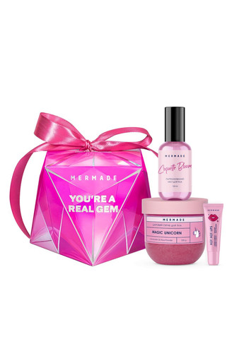 Парфумований набір косметики для догляду за тілом Mermade Pink Crystal 3 в 1 Ви — справжня перлина, гідна найкращих подарунків. Як-от парфумований набір для тіла Mermade Pink Crystal. Стильна коробочка у формі кристала приховує три мастхев-продукти, які допоможуть жінці та дівчині залишатися в центрі уваги та нескінченно чути заслужені компліменти про свою красу. Склад б'юті-набору для догляду за тілом Pink Crystal от Mermade Цукровий скраб для тіла Mermade Magic Unicorn, 250 г Очищає шкіру від лущення, прибирає сухість, роблячи її гладкою і сяйною, немов шовк. У складі — олія авокадо та рисова пудра, які творять справжні дива з вашою шкірою. Парфумований спрей для тіла Mermade Coquette Bloom, 100 мл Цей міст створений для дівчат, які знають про свою привабливу силу та завжди залишаються головними героїнями будь-якого роману. Спрей огорне вас квітково-цитрусовим ароматом. Верхні ноти: гіркий апельсин, персик, фрезія. Ноти серця: жасмин, магнолія, троянда. Базові ноти: мускус, амбра, кедр. Бальзам максімайзер для губ Mermade Hot Hot Lips, 10 мл Плампер надасть губам привабливого об'єму, подарує сяйво, зволожить шкіру. Те, що потрібно для останнього штриха вашого образу! Ви гідні тільки розкішних подарунків — таких, як парфумований набір жіночої косметики Mermade Pink Crystal! Б'юті-бокс потішить не тільки вас, а й ваших близьких. Вибирайте його в подарунок на Новий рік, Різдво або День народження, щоб почути щиру «спасибо»!