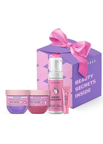 Опис Подарунковий набір Склад набору: Пінка для душу - Mermade Magic Unicorn, 150 мл + Цукровий скраб для тіла - Mermade Magic Unicorn, 250 г + Зволожувальний бальзам для губ - Mermade Magic Unicorn (NEW), 10 г + Слайм-гель для душу - Mermade Magic Unicorn, 200 г. Подарунковий набір від бренда Mermade приваблює яскравим пакованням, вдалою комплектацією. Magic Unicorn Party складається з доглядових і очищувальних засобів, делікатні формули яких адаптовані до всіх типів шкіри. Пінка, скраб, слайм-гель і бальзам для губ мають унікальні аромати та широкий спектр живильних, зволожувальних, відновлювальних переваг, зумовлених високим вмістом активних компонентів натурального походження. Пінка для душу — Mermade Magic Unicorn - презентована у флаконі з дозатором-міксером;- оксамитова піна приваблює ароматом стиглих лісових ягід;- перетворює рутинне купання на справжній спа-ритуал;- не залишає шансів стійкому бруду, неприємним запахам;- сік листя алое вера справляється з ознаками дегідратації;- запобігає повторній появі сухості, тьмяності, лущень;- гідроксиетил сечовина нормалізує і підтримує гідробаланс;- перешкоджає трансепідермальній втраті води;- дбайливо пом’якшує і відновлює епідерміс;- пантенол стимулює його регенерацію, кровообіг;- має протизапальні, заспокійливі, тонізувальні функції. Цукровий скраб для тіла — Mermade Magic Unicorn - вирізняється стійким ароматом з нотами зефіру, ванілі, солодощів;- цукрова основа сприяє ефективному та безпечному очищенню тіла;- позбавляє його стійкого бруду разом з дрібними недоліками;- відлущує ороговілий шар епідермісу;- робить його більш гладеньким, еластичним, пружним;- рисова пудра розчиняє сальні пробки, чорні цятки, вміст забитих пор;- прискорює їхнє звуження і зменшує видимість;- усуває надлишок себуму, регулює секрецію, матує;- амінокислоти олії жожоба зволожують шкіру;- захищає її від негативного впливу зовнішніх факторів;- доповнений блискітками для гарного настрою, бездоганного сяйва. Зволожувальний бальзам для губ — Mermade Magic Unicorn - випущений у компактній тубі, зручній для транспортування;- оснащений кульковим аплікатором, що рівномірно розподіляє бальзам;- густа консистенція миттєво схоплюється, не розтікаючись;- прикрашає вуста досконалим сяйвом, солодким ароматом;- олія оливи піклується про живлення, зволоження шкіри;- формує на її поверхні невагому антиоксидантну мантію;- протидіє вільним радикалам — провісникам фотостаріння;- олія абрикосових кісточок нейтралізує негативний вплив зовнішніх факторів;- запобігає повторній появі сухості, тьмяності, лущень;- збагачений унікальним рослинним комплексом Рlantasoft — аналогом ланоліну;- пантенол прискорює природний процес загоєння ран;- пом’якшує і відновлює чутливий епідерміс. Слайм-гель для душу — Mermade Magic Unicorn - приваблює унікальним ароматом з нотами цукерок і зефіру;- гурманський шлейф добре тонізує, освіжає, дарує відчуття прохолоди;- має унікальну консистенцію слайму, що добре піниться;- ефективно видаляє різноманітні забруднення з тіла;- повертає йому здоровий, доглянутий вигляд з приємним сяйвом;- збагачений зволожувальним соком листя алое вера;- активно бореться з наявними ознаками дегідратації;- запобігає повторній появі сухості, тьмяності, лущень;- чинить протизапальну та заспокійливу дії;- підходить для гігієни дітей від 6 років. Спосіб застосування Пінка для душу - Mermade Magic Unicorn Для використання необх