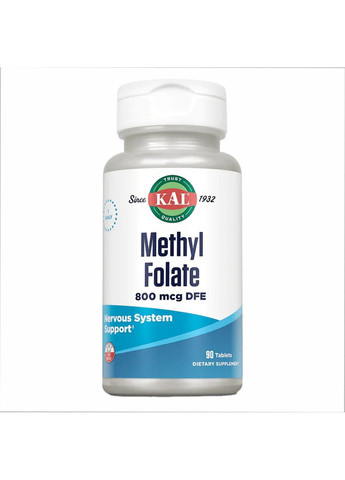 KAL, метилфолат, 800 мкг, 90 таблеток Дієтична добавка. Не є лікарським засобом. Опис - Дієтична добавка - 1 таблетка на день - L-5-MTHF - Метаболічно активний фолат Інформація про продукт. Метилфолат від KAL містить (6S)-5-Метилтетрагідрофолат (5-MTHF). Фолієва кислота призначена для забезпечення поживної підтримки нормального здорового синтезу ДНК, метаболізму гомоцистеїну та роботи серцево-судинної системи. Жінка, яка дотримується здорового харчування та має достатню кількість фолату в організмі, може знизити ризик народження дитини з вродженим дефектом головного або спинного мозку. Для вагітних жінок споживання фолату не повинно перевищувати 250 % від добової норми (1000 мкг). Поживна цінність Розмір порції: 1 таблетка Кількість в 1 порції % від добової норми Фолат (у вигляді (6S)-5-метилтетрагідрофолату глюкозамінової солі) (5-MTHF) 800 мкг 200 % Рекомендації із застосування Застосовувати тільки згідно з інструкцією. Приймати по 1 таблетці на день під час їди або запиваючи склянкою води. Інші інгредієнти Целюлоза, суміш органічного рисового екстракту та діоксид кремнію. Попередження Не слід використовувати цей продукт, якщо захисна плівка пошкоджена або відсутня. Зберігати в недоступному для дітей місці. Перед використанням цього продукту слід проконсультуватися з медичним працівником. Зберігати в сухому та прохолодному місці.