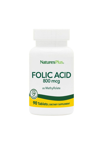 Фолієва кислота, Nature's Plus 800 мкг використовується для профілактики низького рівня фолієвої кислоти, а також його ускладнень: анемії, нездатності кишечника засвоювати поживні речовини належним чином, виразкових колітах, захворюванні печінки, алкоголізмі та при нирковому діалізі. Розмір порції: 1 потреби Фолат (кальцій-L-5-метилтетрагідрофолат) 1333 мкг DFE (800 мкг L-метилфолату) 333%