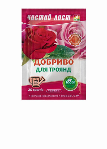 Кристалічне добриво “Чистий лист” укорінювач для саджанців, насіння, розсади - комплексне гранульоване мінеральне добриво для всіх видів рослин, яке сприяє швидкому укоріненню сіянців і приживлюваності розсади й рослин після пересадки. Містить у своєму складі необхідні для повноцінного росту рослини макро- і мікроелементи, а також комплекс вітамінів, який збільшує стійкість до хвороб та несприятливих умов, фітогормони, гумат, бурштинову кислоту - все, аби момент приживлення та вкорінення пройшов якнайкраще. Рекомендується застосовувати добриво протягом усього вегетаційного періоду. Регулярне поливання підвищує ефективність застосування. Норми внесення Спосіб внесення Норма витрати добрива Спосіб використання Полив саджанців і розсади 1-2 мірних ложки розчинити в 5-9 літрах води або 0.5-1 мірної ложки на 2-4.5 літра Поливати 2-4 рази на місяць Позакореневе підживлення саджанців і розсади 0.5-1 мірної ложки розчинити в 10 літрах води Обприскувати 2-4 рази на місяць Замочування насіння 1-2 мірних ложок на 5 літрів води В отриманому розчині замочувати насіння протягом однієї години, після чого помістити у вологе середовище Допускається випадіння незначного інертного осаду. СКЛАД: Макроелементи (%): Азот (N) - 12,5, Фосфор (P2О5) - 19, Калій (K2О) - 14; Мезоелементи (г/кг): Сірка (S) – 53; Магній (MgO) – 11,2. Комплекс мікроелементів (г/кг): Бор (В) - 0,31; Залізо (Fe) – 1,6; Марганець (Мn) – 0,34; Цинк (Zn) – 0,32; Мідь (Cu) – 0,23; Молібден (Мо) – 0,03; Кобальт (Со) - 0,02. Вітамінний комплекс (мг/кг): 840 Солі гумінових кислот (мг/кг): 5500 Фітогормони (мг/кг): 300 Амінокислоти (мг/кг): 1900 Бурштинова кислота (мг/кг): 2000 Основні властивості: Зміцнює життєздатність рослин; Підвищує енергію проростання насіння (в тому числі і газонних трав); Стимулює активне зростання кореневої системи; Пробуджує оптимальний баланс макро- і мікроелементів в зонах активного зростання кореневої системи рослини; Ніжно взаємодіє з паростками. Запобіжні заходи: Обробляти слід у рукавичках. У разі потрапляння на шкіру промити водою з милом. Не допускати потрапляння в їжу і всередину організму. У разі потрапляння в очі промити великою кількістю води. У разі потрапляння всередину організму випити 6-8 склянок слабкого розчину перманганату калію у воді і спричинити блювання. Специфічного антидоту не потребує. Слід звернутися до лікаря. Лікування симптоматичне. Рекомендації зі зберігання: Зберігати в сухих закритих приміщеннях, у недоступному для дітей місці, окремо від ліків і харчових продуктів при температурі від -20° до +40° С, за вологості повітря не більше ніж 65 %.