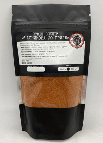 Суміш спецій "Часникова до грилю" використовується для приготування м`ясних, рибних і овочевих страв на грилі або барбекю. М'ясо водночас набуває приємного пряного аромату й апетитного кольору. Суміш має приємний пряний аромат і на смак — трохи пече. Страви, приготовані на грилі, виходять не тільки смачними й ароматними, але ще й корисними, тому що готуються без додаткової олії. До складу входить: паприка червона, сіль, часник, глутамат натрію, куркума, цукор, коріандр, ароматизатор, перець чорний.