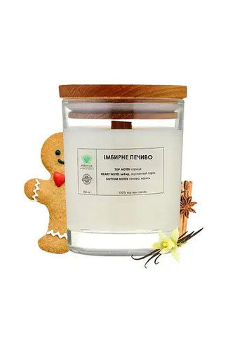 TOP NOTES кориця HEART NOTES імбир, мускатний горіх BOTTOM NOTES печиво, ваніль Час горіння: 40 годин М'який, теплий, святковий і шалено затишний аромат! Щоб створити таку атмосферу, варто тільки запалити гніт - і навколо Вас запанує запах приємної пряної випічки. Щоб створити такий настрій просто в себе вдома, тепер не обов'язково пекти смаколики. Аромасвічка все зробить за Вас. Вам залишається тільки насолоджуватись прекрасним вечором ІНСТРУКЦІЯ ПО ВИКОРИСТАННЮ АРОМАСВІЧКИ: Щоб свічка горіла рівномірно і краще віддавала аромат, є певні рекомендації, дотримуючись яких, вона прослужить Вам довше і якісніше: Щоразу запалюючи свічку , дайте верхньому шару воску повністю розплавитися (близько години), так не буде утворюватися тунель навколо гнота, свічка буде горіти довше і виглядати естетичніше. Перед запалюванням свічки підрізайте гніт до 5 мм (можна просто відламати обгорілий край рукою). Це потрібно для того, щоб полум'я було рівним, не коптилось, а обгорілі вуглинки не падали в віск. Не задувайте свічку! Щоб не зіпсувати аромат свічки запахом гару - досить просто накрити її кришечкою і вона сама згасне за кілька секунд без доступу кисню. А потім відразу відкрити її, щоб дим вийшов і не змішався з аромамаслами. Не залишайте запалену свічку без нагляду. Розміщуйте якомога далі від займистих поверхонь. Не паліть свічку більше 3-4 годин, віск може перегрітися і аромат стане менш яскравим. В крайньому випадку, можна погасити свічку на 15 хв, дати їй охолонути, а потім запалити знову. ОБЕРЕЖНО! Під час горіння стакан сильно нагрівається!Не залишайте в межах доступу тварин та дітей. ПЕРЕВАГИ НАТУРАЛЬНИХ АРОМАСВІЧОК ВІД PURITY: Виготовлені із 100% екологічно чистого соєвого воску вручну, Не виділяють шкідливих токсичних речовин. Горять повільніше та довше Наші натуральні свічки коптять на 90% менше, ніж парафінові Завдяки натуральному дерев'яному гнотові створюється заспокійливий звук каміна (потріскування). Ароматичні олії преміум-якості І як же не згадати про терапевтичний ефект та вплив кожного із запахів!