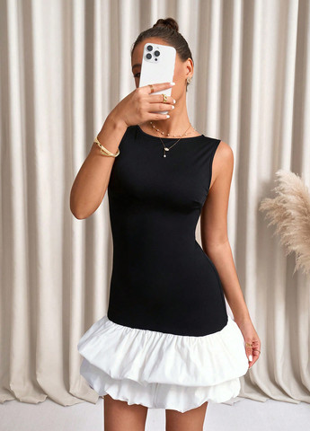 Міні-сукня – SHEIN Clasi Dress. Ця стильна міні-сукня виконана в чорно-білій кольоровій гамі. Вона має круглий виріз горловини і крій, що облягає. Сукня виготовлена з трикотажної тканини. Вона має багатошарові деталі та середню лінію талії. Підходить для різних випадків, включаючи подорожі та світські заходи. Можна прати у пральній машині або чистити у хімчистці.