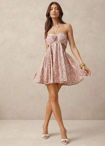 Елегантна міні-сукня L’Amorae з квітковим принтом. Це літнє сукня, що струмує, з геометричним квітковим принтом. Виріз халтер та висока талія. Сукня без рукавів, облягає фігуру. Прати в пральній машині м'яким миючим засобом.