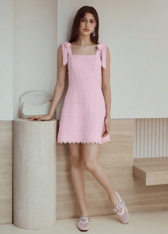 Це рожева міні-сукня з квадратним вирізом та високою талією. Сукня А-силуету, приталеного крою. Застібка-блискавка. Можна прати у пральній машині або чистити у хімчистці.