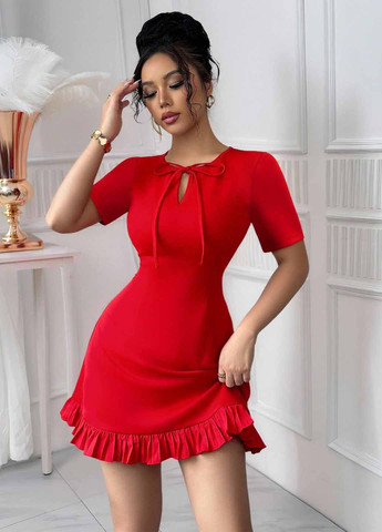 Червона трикотажна міні-сукня Elenzga. Це облягаюча міні-сукня з круглим вирізом та короткими рукавами. Спереду зав'язується бант, а поділ розкльошений. Сукня виготовлена з трикотажної тканини. Сукня підходить для повсякденних випадків. Можна прати в пральній машині.