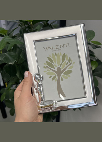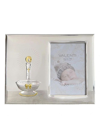 Італійська компанія Valenti & Co створила лінію товарів для дітей. Серед виробів є фоторамки. Вони виготовлені з плити МДФ білого кольору, карбування зі срібним покриттям та стекла. При виготовленні використовують матеріал MIRO-SILVER – це нова металева обробка поверхні, до якої входить куля чистого срібла, отримана за допомогою методики вакуумного напилення, що придає покриттю твердість і більшу стійкість до окислення. Розмір фото, яке можна розмістити – 10 х 15 см. На зворотній стороні є ніжка, тому рамку можна поставити у будь-якому куточку вашого оселі. Таїнство в житті кожного християнина - це Таїнство Хрещення, тому фоторамка із зображенням чаші буде чудовим подарунком для малечі на Хрестині. Виріб запакований у мішечок та коробку з логотипом Valenti. Рекомендації щодо догляду: не використовувати хімічні засоби, протирати м'якою сухою ганчіркою.