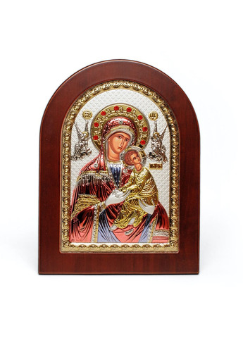 Оклад образу виготовлений із листа Miro-Silvero (італійського виробництва); нижня основа матеріалу - алюмінієвий віддзеркалюваний метал ALADO який зверху ламінований сріблом 999 проби тонким шаром. Срібло покрите захисним оксидним лаком, який зберігає матеріал від потемніння та зовнішніх подразників. Окремі частини ікони прикрашені сусальним золотом. Всі елементи сюжету ікони до найменших деталей та узорів чітко вирізьблені на окладі, які разом створюють гармонійну прекрасну картину.Поверх срібла Ікона прикрашена різнобарвною ювелірною емаллю, що придає образу більш живого та яскравого виглядуЗакріплений оклад в дерев'яній основі (кіоті) аркової форми, яка виготовлена із МДФ покритого шпоном дерева. Ззаду ікони є відкидна ніжна та отвір для кріплення на стіні.Колір дерева: коричневий (горіхова текстура).Лик ікони прописаний на полотні натуральними фарбами "Темпера" за допомогою метода шовкографії.Образ упакований в оригінальну картонну коробочку від виробника з логотипом компанії, яка має чудовий подарунковий вигляд.Ззаду на іконі є закріплений Сертифікат якості, який засвідчує оригінальність виробу.Виробник: Prince Silver Греція.