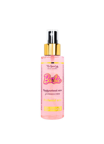 Парфумований міст-спрей для тіла та волосся Top Beauty Barbie із золотистим шиммером, 100 мл Парфумований спрей-міст для тіла та волосся Top Beauty Barbie - для тих, хто цінує ніжність та свіжість, і хоче бути у тренді. Спрей з найдрібнішим золотим шиммером і приголомшливою фруктово-квітковою композицією зробить кожен ваш день особливим і відмінно підійде як для офісу, так і для романтичного побачення і навіть вибухової вечірки, де вам захочеться блищати і чарувати. Цей продукт стає справжнім порятунком у спекотний день або після інтенсивного тренування. Парфумований спрей-міст Barbie наділений приємним ароматом, в якому поєднуються нотки кокоса, малини, троянди, даруючи вам неймовірне відчуття свіжості та комфорту. Ніжні блискітки надають вашій шкірі легкого золотистого сяйва. Ароматичний спрей для тіла ніжно зволожує шкіру, роблячи її бархатистою та м'якою, при цьому не залишаючи жирних слідів. Спосіб застосування: нанесіть спрей на тіло та волосся. Об'єм: 100 мл.